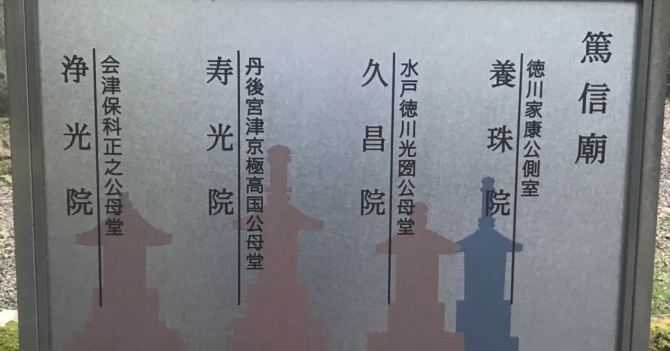 水戸光圀公母堂と徳川家康の側室 養珠院の供養墓碑が並んでいます。