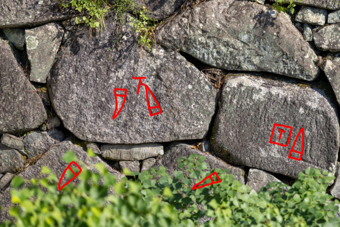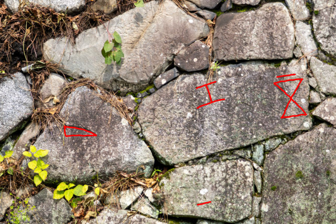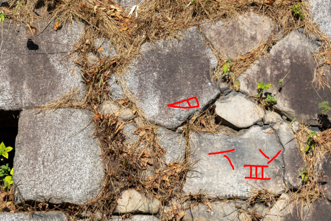 ここの注目は左上の小さな石に刻まれた「違い山形」+「・・・」と、