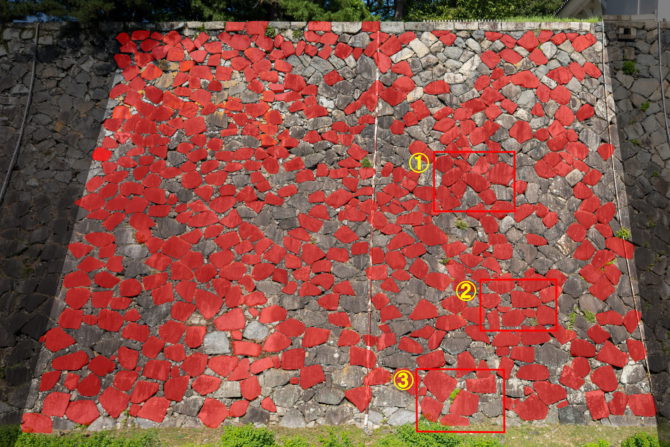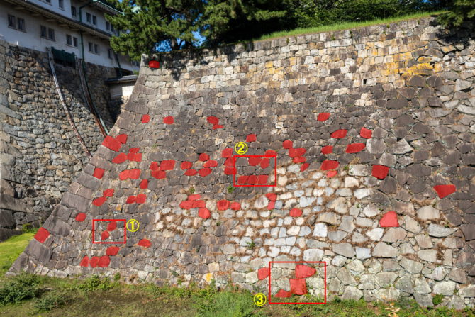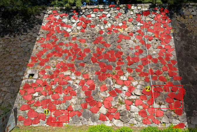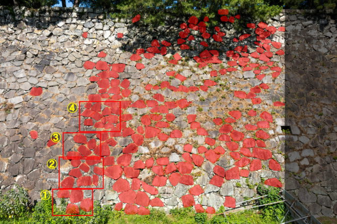調べてみると、本丸西壁だけで刻印の総数は1500超もありました。